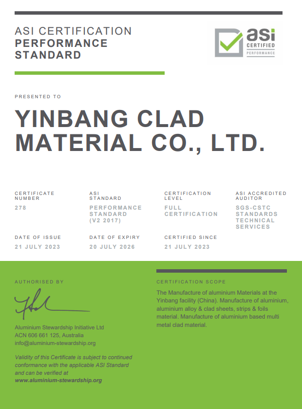 银邦金属复合材料股份有限公司位于中国无锡的制造工厂已成功通过ASI绩效标准认证。