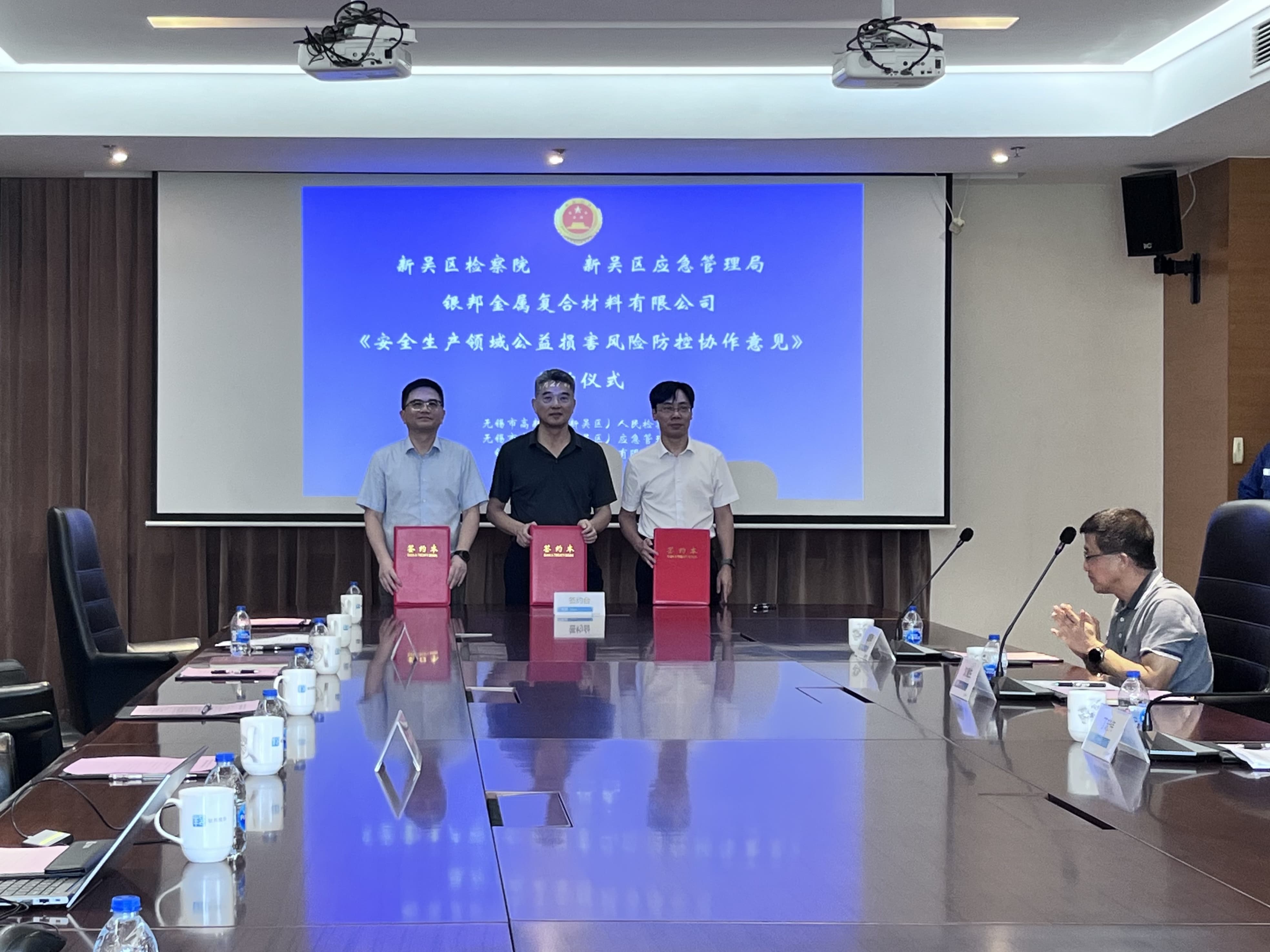 为贯彻落实最高检“八号检察建议”,助推安全生产领域公益损害风险防控,服务保障新吴经济社会高质量发展,8月27日,“检-政-企”安全生产领域公益损害风险防控协作意见签约仪式在银邦金属复合材料股份有限公司召开。